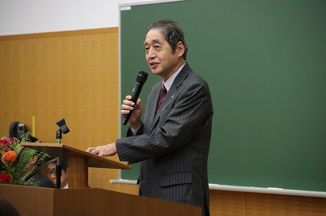 引き続き、来賓の田原学長から挨拶があり、前述の不祥事に関しこれまで禁止薬物使用防止について学生の