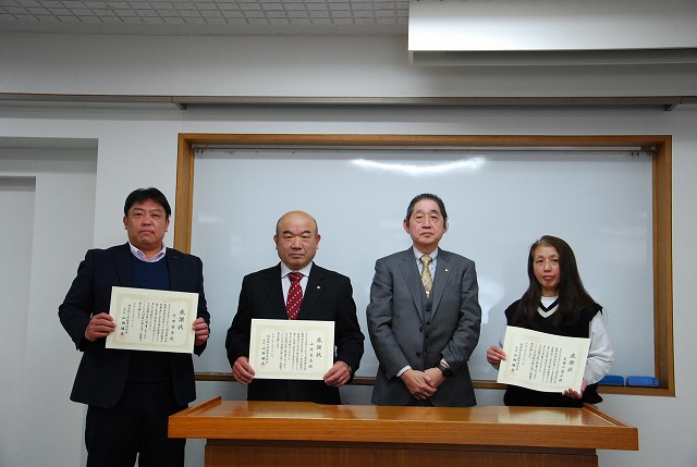 大学から瀬野隆理事長、教育後援会から山田会長、矢田副会長、山根幹事長が出席して瀬野理事長に